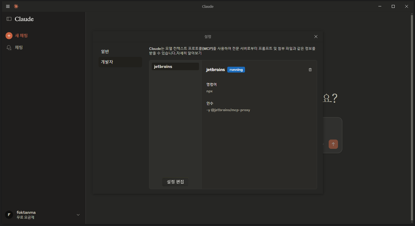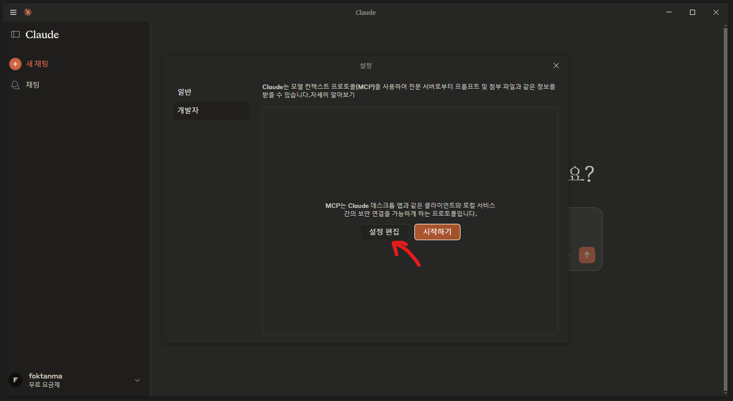 Claude Desktop App > 파일 > 설정 > 개발자 > 설정편집