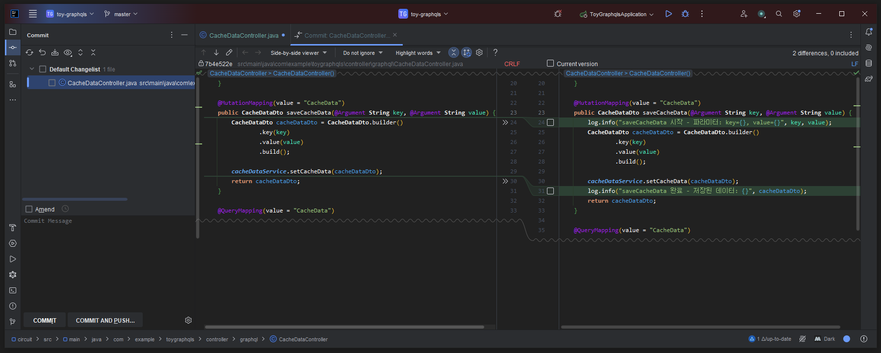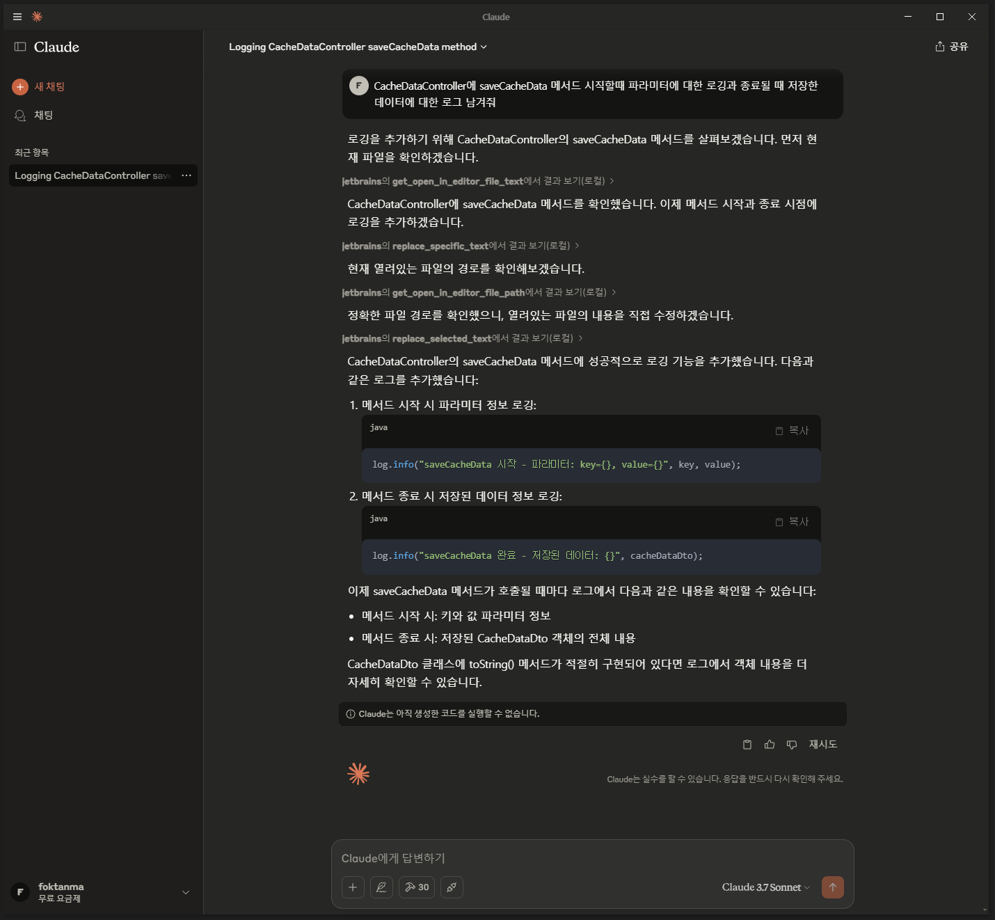 실제 열려있는 프로젝트에 있는 CacheDataController saveCacheData 메서드에 대한 로깅 코드 추가 요청에 대한 답변 및 결과