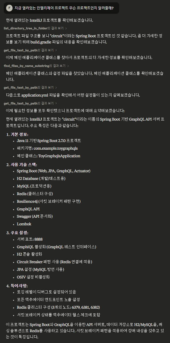 - 지금까지 IntelliJ ↔ Claude Desktop App 간의 MCP 연동 과정을 따라가며 실제 프로젝트에 AI의 도움을 받아보는 과정을 소개했습니다. 간단한 설정만으로 Claude에게 프로젝트를 분석시키고, 특정 파일을 직접 수정하도록 요청할 수 있다는 점은 개발 생산성 향상에 매우 매력적인 요소입니다.