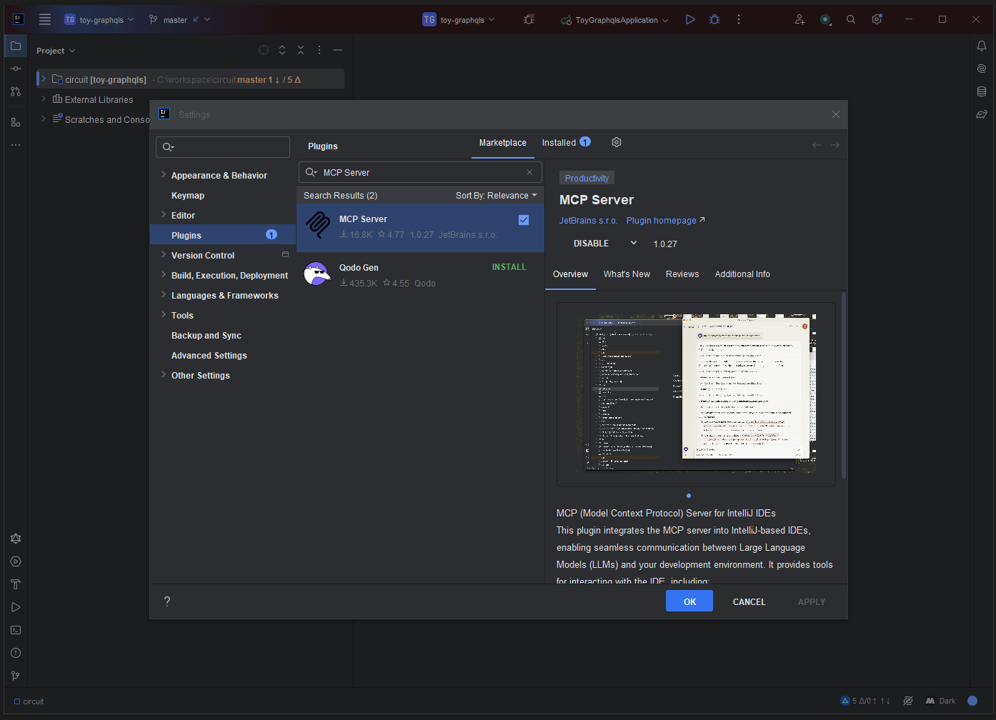 Settings > Plugins > MCP Server 검색